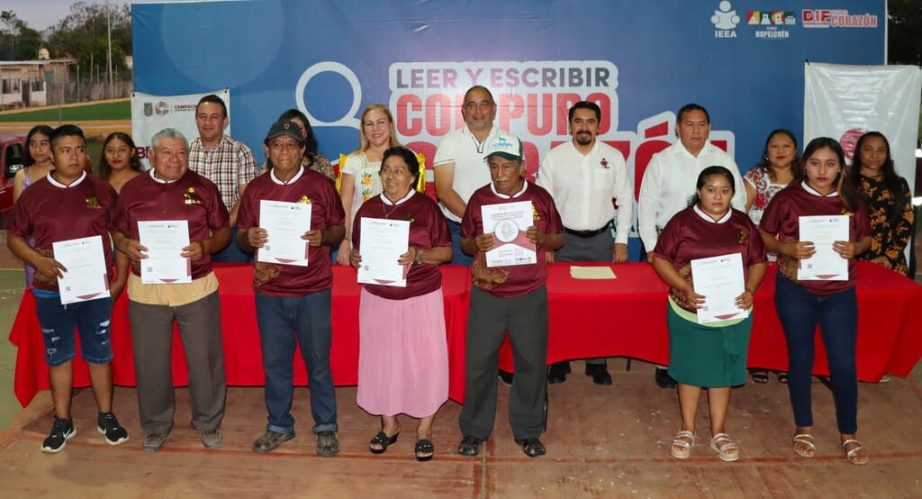 El Instituto Estatal de la Educación para los Adultos (IEEA) realizó la entrega de 32 constancias de alfabetización, 12 certificados de primaria y 16 certificados de secundaria en la localidad de Vicente Guerrero, municipio de Hopelchén, sumando un total de 60 documentos oficiales otorgados a jóvenes y adultos que concluyeron su educación básica.